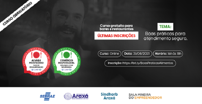 Ambiente seguro e qualidade de atendimento. A Secretaria Municipal de Desenvolvimento Econômico, Inovação e Turismo, o Serviço Brasileiro de Apoio às Micro e Pequenas Empresas (Sebrae Minas), o Sindicato do Comércio Hoteleiro e Similares do Planalto de Araxá (Sindhorb) e a Sala Mineira do Empreendedor realizam o último curso gratuito de boas-práticas para atendimento seguro contra a Covid-19 na próxima terça-feira (31).