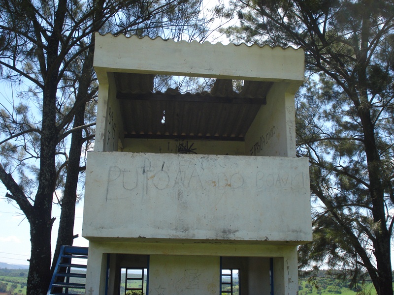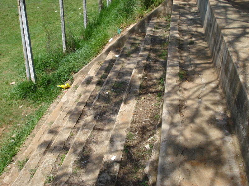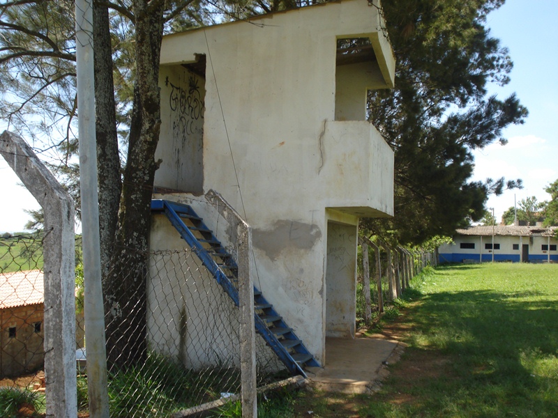 A cabine destinada à transmissão de futebol pelos veículos de comunicação está sem uma parte do telhado e a porta foi danificada. As paredes estão todas pichadas por ação de vândalos. Arquibancadas que antes recebiam torcedores, hoje estão estragadas.