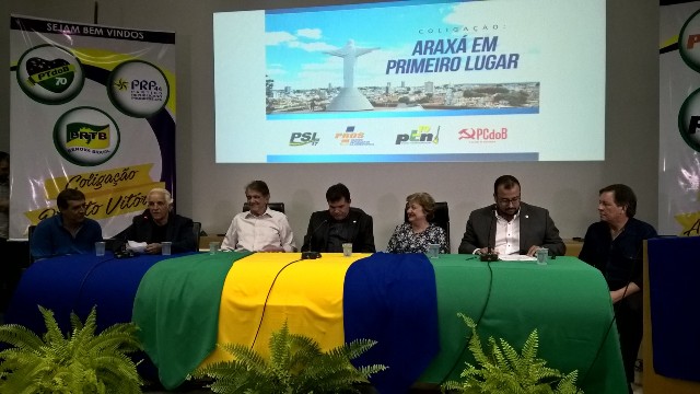 A Coligação Araxá em Primeiro Lugar engloba o Partido Social Liberal (PSL), Partido Comunista do Brasil (PC do B), Partido Trabalhista Nacional (PTN) e Partido Republicano da Ordem Social (Pros).