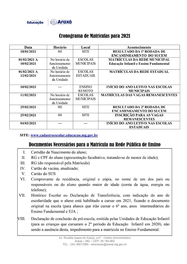 As unidades estaduais e federais devem iniciar suas aulas em datas estabelecidas pelo Estado de Minas e o Governo Federal. Ainda de acordo com o decreto, as medidas e datas estabelecidas poderão ser alteradas ou revogadas em decorrência de agravamento da pandemia em Araxá. Leia o decreto!