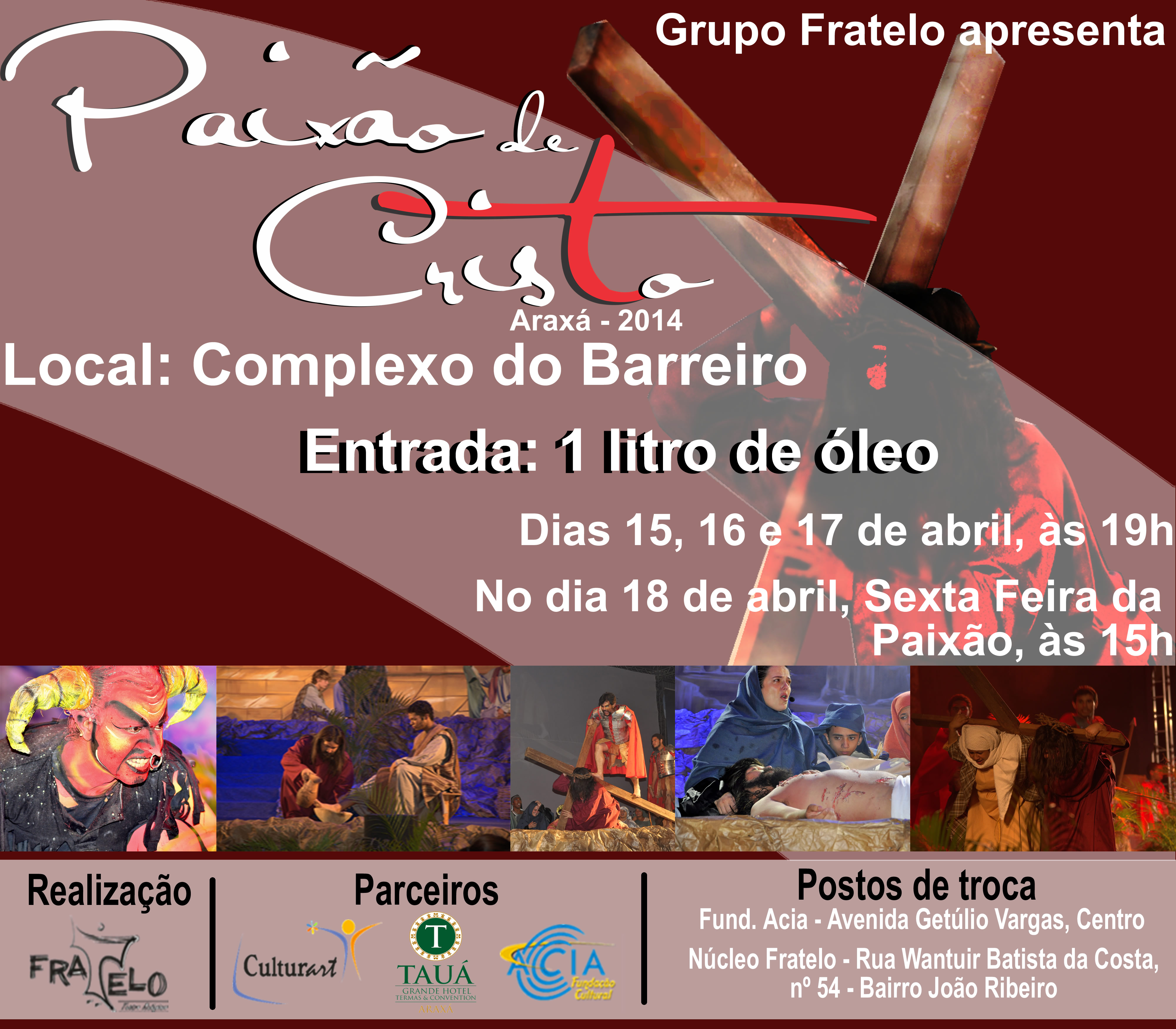 A montagem é realizada pelo Fratelo e tem como parceiros a Fundação Cultural Acia, a Cooperativa Cultura e Arte e o Grupo Tauá, que cedeu as instalações do Grande Hotel e as áreas de jardim do Complexo do Barreiro, para a realização do espetáculo, que em 2014 traz uma roupagem completamente diferente do que já foi visto na Paixão de Cristo e em espetáculos na cidade.