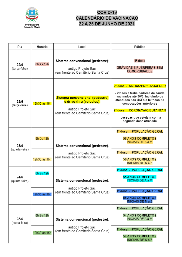 A Prefeitura de Patos de Minas continua a vacinar a população em geral na semana que vem, a partir de quarta-feira (23). Estão convocadas as pessoas de 56 a 54 anos completos, conforme calendário abaixo.