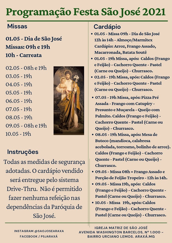 A festa em louvor ao Santo padroeiro das famílias começa no próximo sábado, dia 1º de maio, e segue até o domingo da semana seguinte, dia 09 de maio, na Paróquia de São José. Na programação missa diariamente, quermesse nos finais de semana, e um sábado de feriado com muitas ações, adotando todos os protocolos sanitários impostos pela pandemia da Covid-19. “São José, advogado do gênero humano em todas as suas misérias” é o tema da edição 2021, ano em que a Igreja Católica celebra o ano de São José.