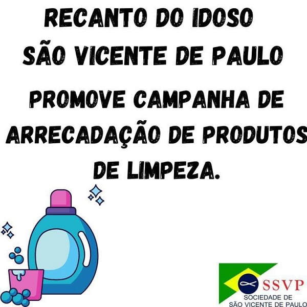 Manter o ambiente limpo é muito importante para que se preserve o bem-estar e a saúde das pessoas que convivem no local. O Recanto do Idoso São Vicente de Paulo de Araxá realiza nesta semana a campanha para arrecadação de produtos de limpeza.