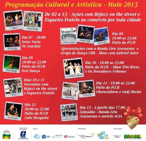 A Associação Comercial, Industrial, de Turismo, Serviços e Agronegócios de Araxá (Acia), através do Ministério da Cultura, pela Lei de Incentivo à Cultura, com apoio da CBMM (Companhia Brasileira de Metalurgia e Mineração), realiza a partir do dia dois de maio, mais uma grande programação em comemoração ao Dia das Mães.